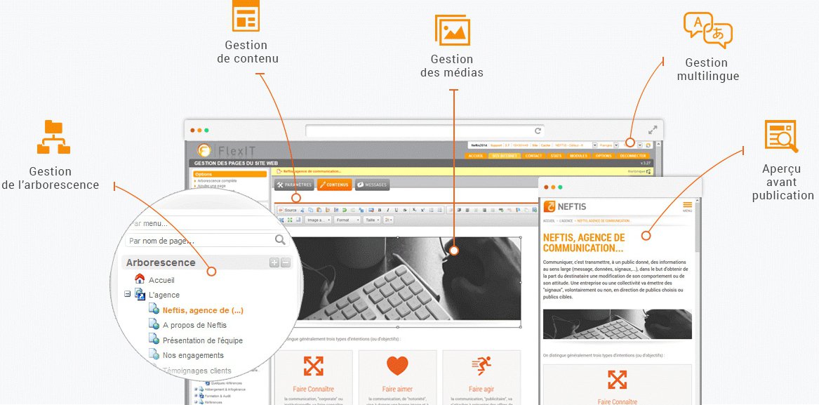 Flexit vous permet de créer, de modifier et d'enrichir le contenu de votre site en temps réel.